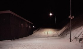 Nuit mi noire, mi blanche. À gauche, on devine des constructions. Au bout de la route, une lumière - la dernière. Film « immobile » et muet, Nightsnow met l’image à l’épreuve de la durée. La boucle, qui scelle le retour du même, l’enserre dans un temps cyclique, une léthargie qui n’est pas étrangère à la neige. 5 minutes 1 secondes, indéfiniment répétées, où le temps s’étire dans l’observation. Théâtrale, l’image nous immerge dans une atmosphère feutrée, une permanence qui appartient au monde naturel et non humain. L’échelle de la projection, invite le spectateur à s’y plonger - à l’instar d’estampes ou de paysages romantiques, qui conduisent le regard du proche vers le lointain.