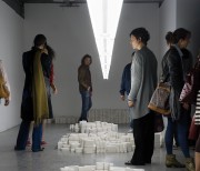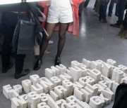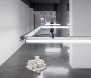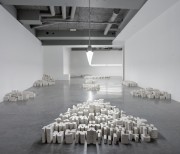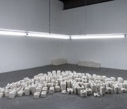 The artist dismantled phrases said by philosophers, sociologists and other figures above within his philosophical horizon, creating heaps of letters in the form of hand-made plaster casts... The white letters measured 16 cm in height and were placed in tidy piles: the ‘A’s together, the ‘B’s together, and so on. Through these, Melik Ohanian evoked a pre-linguistic stage of language. Each heap corresponded to the retranscription of the soundtrack extract of a figure’s voice, but here the letters forming this retranscription were piled up on the floor in disorder. Estrangement. Only a plaque bearing the name of the person quoted was present above the line of neon lights above the heaps, informing us of the paternity of the quotation. A few words emerged from this sea of letters, because the visitors were allowed to move the plaster letters around to re-introduce some meaning. Although the quotations were set out in Le Plateau like a series of archipelagos reduced to pure morphology, to their simple three-dimensional form, the fact remains that these were linked to another archipelago (the 15 joint exhibitions) and to the website, which in some way restored a territory to the whole in a movement of deterritorialisation/ reterritorialisation reminiscent of Deleuze. The “reading” of the heaps of letters was thus influenced — in advance or retroactively — by the meaning conveyed through the Internet.