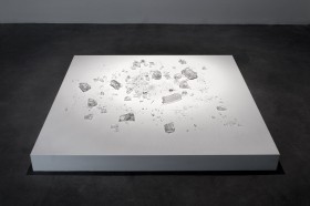 En amont, le fusil de cristal avait été moulé par un artisan, à partir d’une arme réelle. Cet objet a été façonné en toute conscience de sa finalité - l’artisan ayant donné son accord pour que soit détruit le produit de son travail. Le geste minimal de destruction, qui contraste avec le savoir-faire qui a été déployé, initie donc un processus de création paradoxal : production, mémorisation de l’objet, destruction, présentation du résultat de cette destruction. Désacralisant l’objet d’art et sa valeur supposée, ce processus sacralise à l’inverse le geste de destruction, en plaçant sur un socle les débris qui en ont résulté. L’objet et sa forme ont disparu, seul reste tangible le basculement qui a présidé à la (dé)construction de l’œuvre.